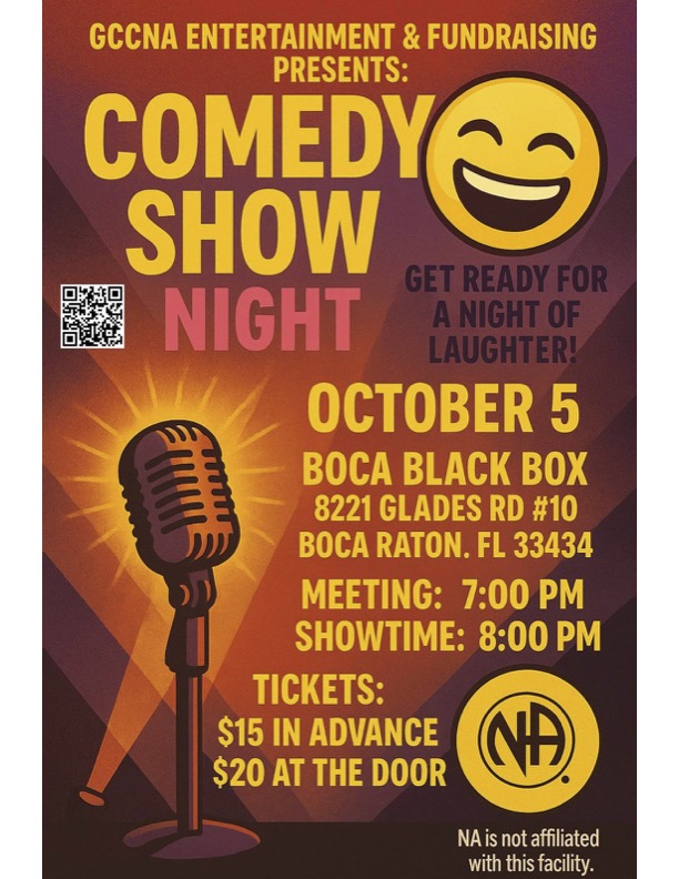 GCCNA ENTERTAINMENT &FUNDRAISING PRESENTS: COMEDY SHOW GET READY FOR A NIGHT OF LAUGHTER! OCTOBER 5 BOCA BLACK BOX 8221 GLADES RD #10 BOCA RATON. FL 33434 MEETING: 7:0 0 PM SHOWTIME:8:0 0 PM TICKETS: $15 IN ADVANCE $20 AT THE DOOR