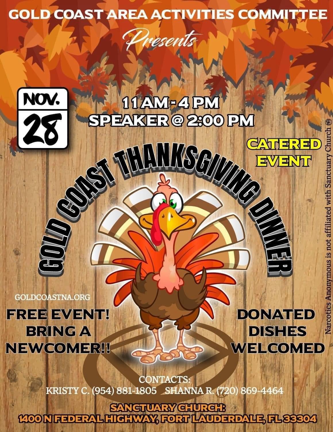Gold Coast area Activities Committee annual FREE Thanksgiving Dinner/ speaker event with all the fixings. Please bring a newcomer
